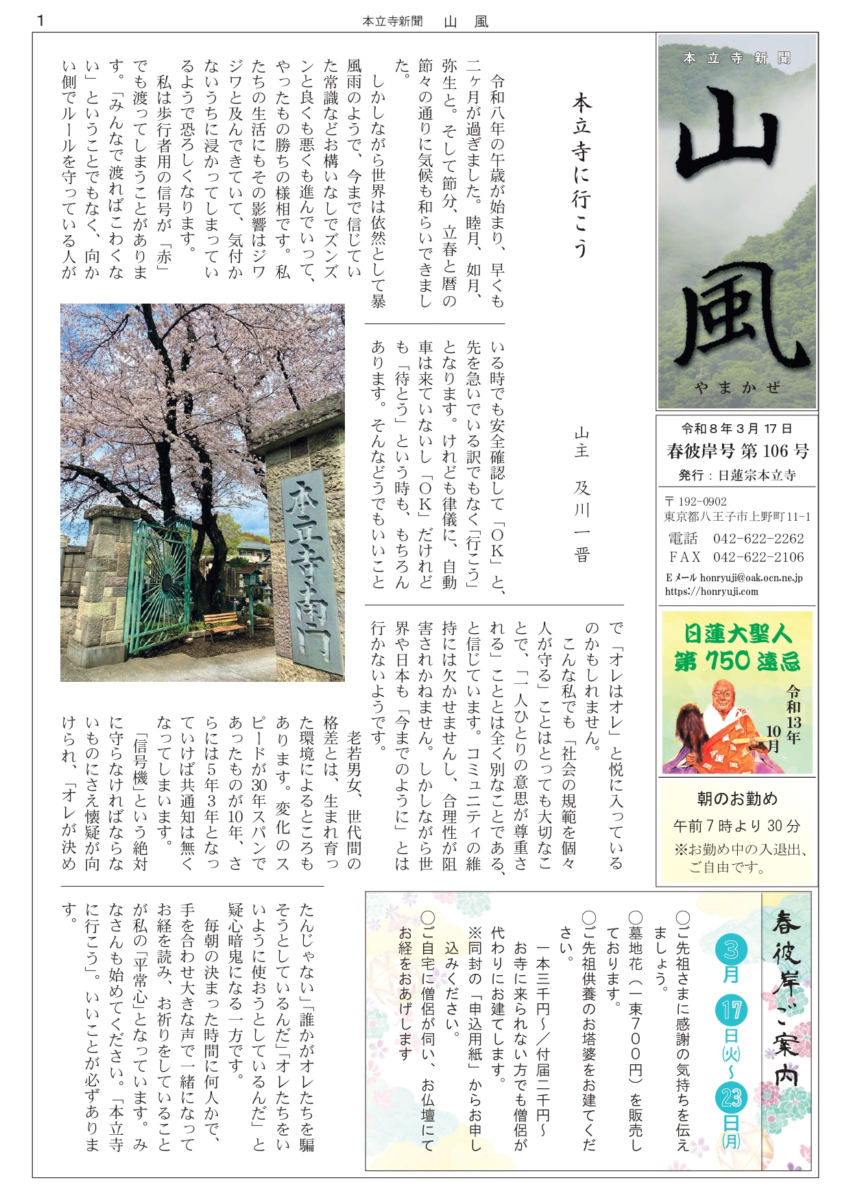 寺報『山風』106号 春のお彼岸に向けて